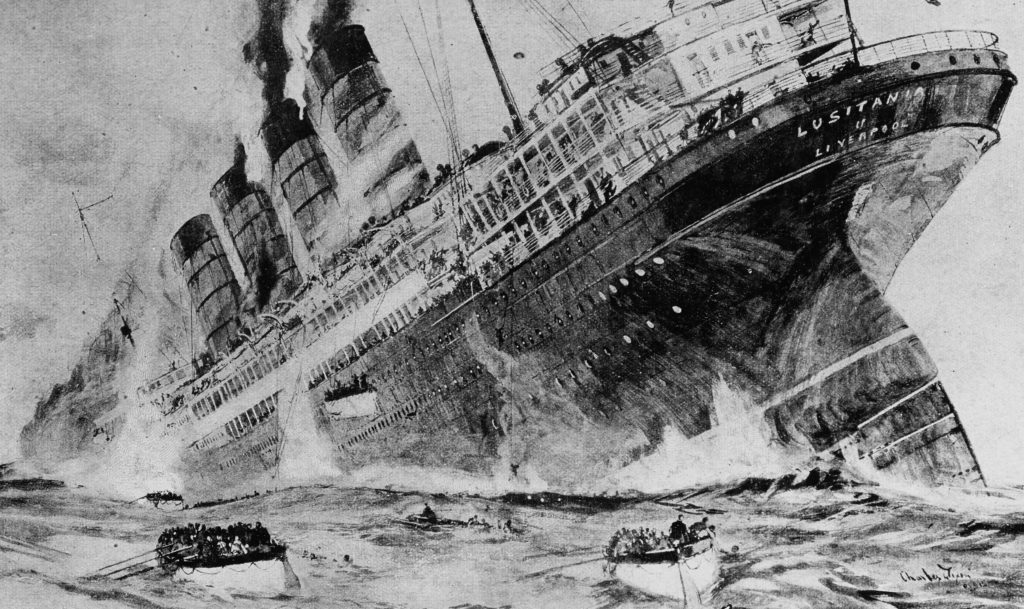 On May 7 1915 the British ocean liner RMS Lusitania which primarily ferried people and goods across the Atlantic Ocean between the United States and Great Britain was torpedoed by a German U-boat and sunk. The Lusitania was carrying war materials. It was torpedoed and sunk by a German submarine in 1915 killing 1198 passengers and setting the United States on the road to war.